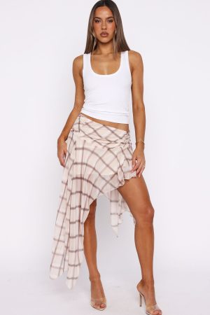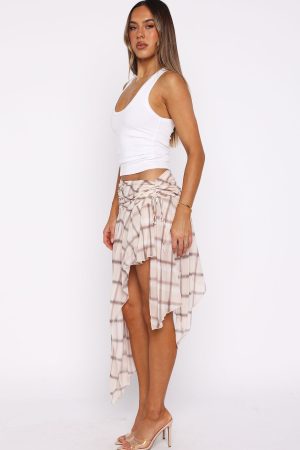 NEWEST OBSESSION: midi skirts! The Keeping Secrets Midi Skirt in Neutral Check features a fixed waistband with ruched detailing. a side front drawstring. and a front leg split. Its handkerchief hem adds a playful touch. while the lining and invisible side zipper with hook-and-eye closure ensure a flawless fit. Style with a basic tank and kitten heels for a flirty summer fit.