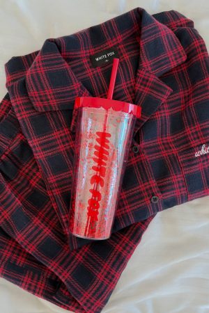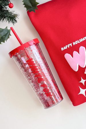Festive. fun. and made to shine! The Kylen Tumbler 700mL in Red Glitter features a clear base with sparkling red glitter. bold White Fox text down the side. a secure screw-top lid. and matching red straw. your perfect holiday sip companion.