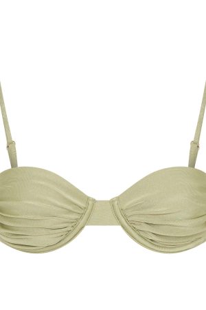 Island vibes. meet your match! The La Pelosa Bikini Top Olive features thin. adjustable shoulder straps. bust underwire. ruched detailing and back clasp closure. Make sure to add the Shore Line Bottoms to your cart for an unforgettable look!
