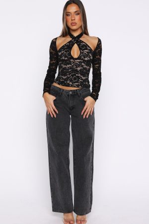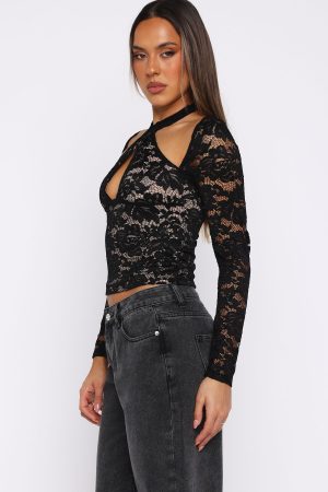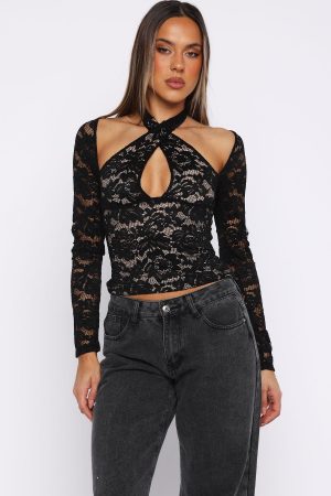 Spice up date night in the Last Time I Needed You Lace Top in Black. This sultry piece features self-tie halter straps with knotted detailing at the front. a plunging neckline. and long sleeves. Crafted from sheer lace. the fitted silhouette is enhanced by a lined bodice and bust. Style with denim jeans. kitten heels and layered gold jewellery for the perfect night out fit.