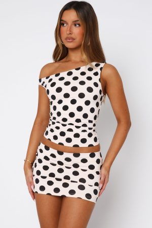 Bring the heat to your new season wardrobe with the Late Nights Mini Skirt in Cream Polka Dot This mini skirt is low-waisted and features stretch fabric for an easy slip on design. We love this styled with the matching Stay With You Top Cream Polka Dot and sandals for a fire look!