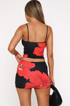 Bring the heat to your new season wardrobe with the Late Nights Mini Skirt in Scarlet Noir. This mini skirt is low-waisted and features stretch fabric for an easy slip on design. We love this styled with the matching Keep Up With Me Top and clear mules for a fire look!