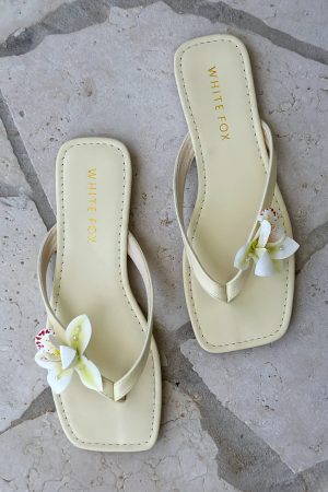 Pull your fit together with the Rhea Orchid Thong Mules in Lemon. Featuring a square open toe and chic orchid‑inspired detail on the thong straps. Style them with a matching set and a playful flower clip for a fresh. sunny look that’s perfect from brunch to beachside walks.
