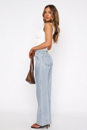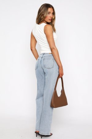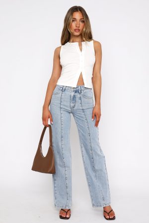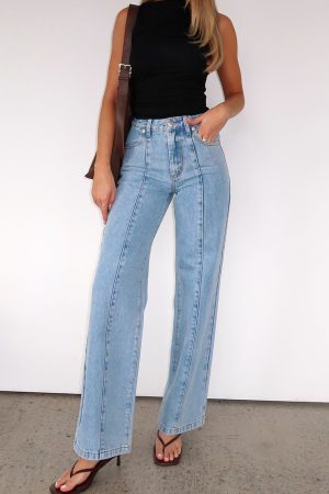 This seasons must have wardrobe addition! The Layla Mid Rise Straight Leg Jeans Light Blue features a zip and button closure. belt loops. straight leg design. front seam detailing and 4 pocket design. For the ultimate cool girl look pair with kitten heels and a crop.