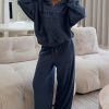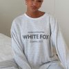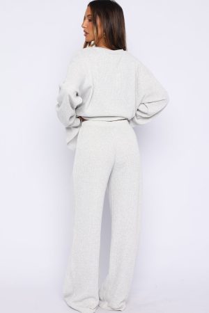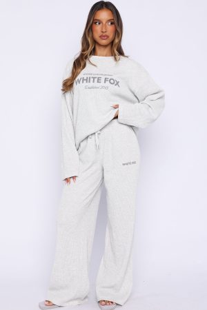 Snuggle into the Leave Me Out Of It Waffle Wide Leg Sweatpants Grey Marle. Features waffle-textured wide leg sweatpants featuring a thick elasticated waistband with external drawstring. soft unlined interior and relaxed silhouette with White Fox text on the front for a cosy. stylish look. Pair them with the matching Leave Me Out Of It Waffle Oversized Long Sleeve Tee Grey Marle and slippers for effortless loungewear comfort.