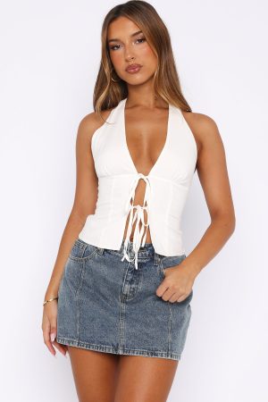 The Leaving Now Halter Top White will take you from brunch to bar. Featuring a halter neck design. backless. low plunge neckline. front cut out detailing with self tie closures. cropped length and light-weight material. Style with a denim mini skirt and gold accessories for a chic look!