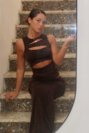 Stand out from the crowd in the Less Than Zero Top in Bronze. Featuring a high neckline. cut-out front design and metallic. stretch fabric. We love this paired with the Never Again Maxi Skirt and clear heels and make them stop and stare.