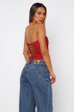 What’s not to love about the Let It Go Strapless Bustier Rouge Zebra! This bustier is a strapless style with grip tape. straight neckline. boning in bodice. lace-up back design. lined fabric and gorgeous printed fabric. Pair with a pair of White Fox jeans and mini bag.