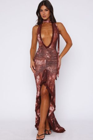 Make it YOUR moment in the Let It Ride Halter Maxi Dress in Burnt Umber! Features a separate neck scarf. halter neckline. ultra low plunge. front leg split with frill detailing. ruched detailing on waist. backless and invisible zipper with hook and eye closure. Complete this stunning look with gold accessories. heels and a shoulder bag.