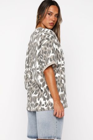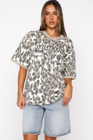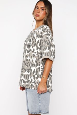 Slip into the Let’s Just Leave Oversized Jersey in Washed Leopard Print and instantly elevate your chill-but-cool style. This laid-back tee features an oversized fit. soft V‑neckline. slouched shoulders. short sleeves and unlined fabrication for effortless comfort. The front showcases bold White Fox text and printed graphics. Pair it denim shorts and some chunky gold jewellery to complete a cool. curated look that’s sure to turn heads.