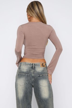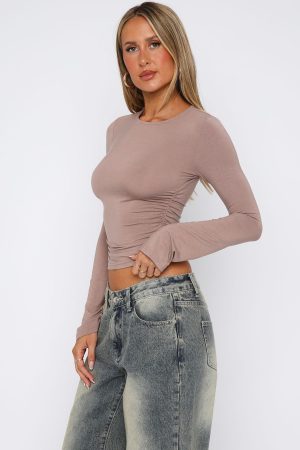 The basic you didn’t know you needed! The Letters To You Long Sleeve Top Taupe features a high cut neckline. long sleeves with slight flare. figure-hugging fit. cropped length. ruched detailing on sides and stretch material for an easy slip on design. Pair with your favourite White Fox Denim bottoms for the perfect autumn fit!