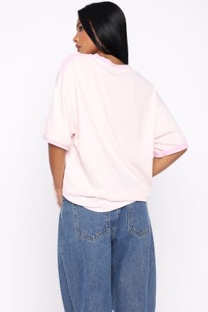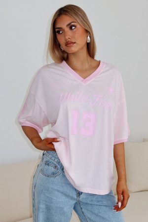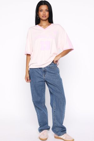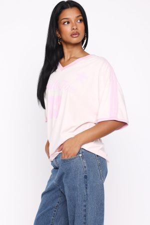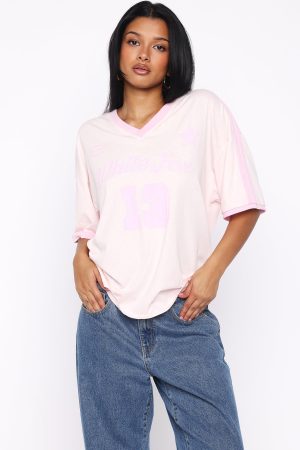 Manifest your dream life in style! The Life Goals Oversized Sports Tee in Pink features a subtle V-neckline. slouched shoulders. and short sleeves accented with double stripe detailing. The oversized silhouette is complemented by a printed White Fox text paired with the number 13. a star. and EST 2013 graphic. Ribbed neckline and sleeve cuffs add structure. while the unlined. semi-sheer fabrication offers a laid-back feel. Style with your go-to denim jeans and chunky gold jewellery.