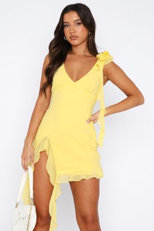 Grab yourself the Like That Mini Dress Buttercup as the styling staple for the new season. Features a plunge neckline. rosette on the strap. frill drop hem. invisible zipper on the side and lined fabric. Complete the look with clear heels and gold accessories for a look that is sure to turn heads!