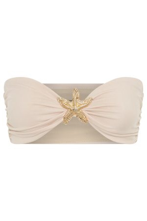 Steal all the attention in our Lil Mermaid Strapless Top in Latte! Features a strapless neckline with grip tape for support. gathered fabrication on side and statement oversized shell gold hardware detailing centre front. Team with the matching Lil Mermaid Maxi Skirt in Latte for a stunning dinner fit!
