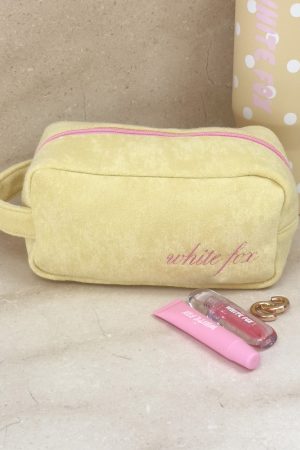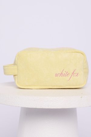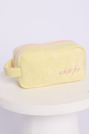 With the holiday season around the corner. the Lillian Cosmetic Bag in lemon is the perfect cheerful companion. Its sleek rectangular shape. secure zipper closure. and side handle make it both practical and stylish. The soft yellow fabric is thoughtfully embroidered with White Fox lettering on the front. Ideal for gifting or keeping all your beauty essentials organized in style.