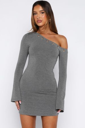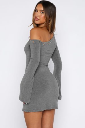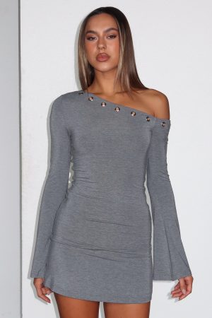 The perfect concert fit has arrived! Introducing the Live Loud Long Sleeve Mini Dress in Charcoal. Features one shoulder neckline with silver eyelet detailing. long flared sleeves. mini length. high stretch fanrication and lined. Pair with kitten heels to dance the night away!