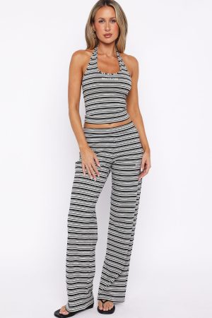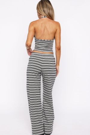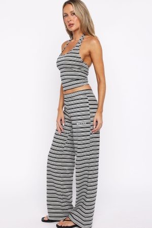 The cutest casual set has arrived! The Looking Back Wide Leg Pants Grey Stripe feature a thick. elasticated waistband. stretch material for an easy slip on design. finished with a side logo detailing. Style it with the matching Looking Back Halter Top Grey Stripe for a comfy and cool fit.