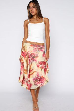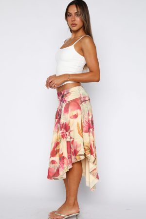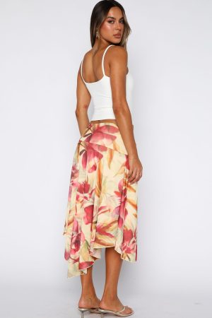 The skirt you planned your trip around! The Losing What We Had Midi Skirt in Sunlight Bloom is designed with a thin elasticated waistband and high front split that offers a cheeky glimpse of the leg. The skirt is fully lined. ensuring a smooth silhouette. and features a asymmetrical hem for dynamic movement. Pair with a basic tank and wedge heels for the ultimate summer vibe!