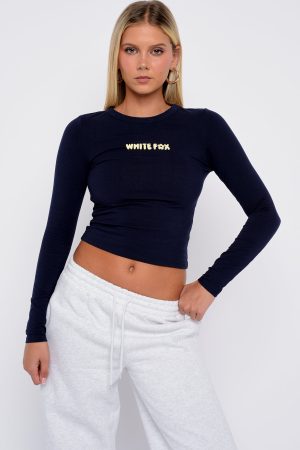 Addicted to Baby Tees? Meet your new fave: the Love Addiction Long Sleeve Baby Tee Navy. With its high neckline. stretch fabric. and puff‑print White Fox text at the centre front. this unlined. easy‑slip‑on design is made for effortless style. Pair it with sweatpants and gold accessories for a chic. cozy look that’s simply irresistible.