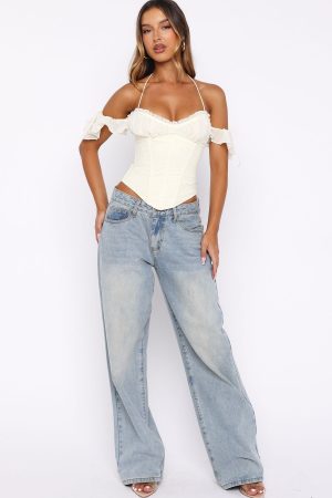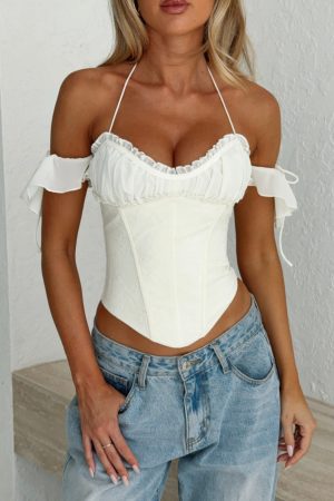 Hot girl summer in the Love Is Free Bustier in Off White! It features an off-the-shoulder neckline with self-tie shoulder and halter straps. a curved neckline with frill hem. and an under-bust seam. The lace bodice includes internal boning for support. while the corset-inspired lace-up back adds a touch of allure.