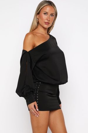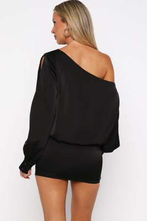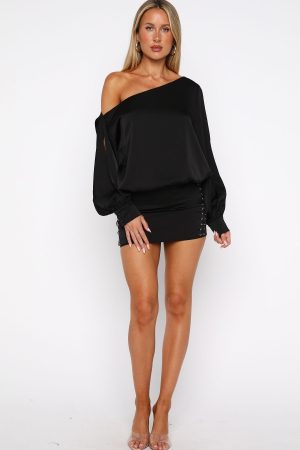 The Love Letter Long Sleeve Mini Dress in Black is a party-ready piece that speaks for itself. Featuring an off-the-shoulder design. long sleeves with cuff and button detailing. figure hugging fit at skirt with side self-tie. lace-up closure and lined material. Style with simple heels and jewellery to let the dress do all the talking.