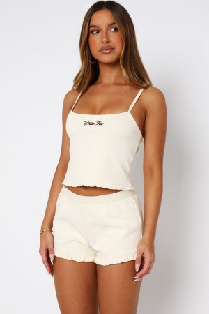 Introducing your newest get ready with me fit! The Love Matters Pyjama Top in Cream features adjustable thin straps. subtle round neckline. stitched White Fox dainty text centre front and girly ruffle hemline. Feel your cutest by pairing with the matching Love Matters PJ Shorts in Cream.