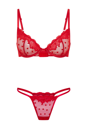 Raise temperatures and set hearts racing in the Love Me Later Lingerie Set Red. This Intimates set features underwire bra with thin. adjustable straps. hook and eye closure and sheer. lace fabric and lace thong with love heart detailing. Pair under any outfit to feel extra fun and flirty.