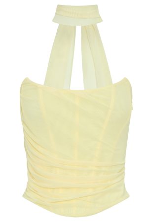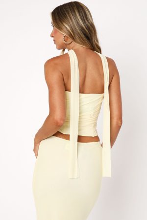 The Lovers Lane Strapless Bustier Lemon is our ultimate dream come true! Features a neck tie design. strapless neckline. boning in bodice. invisible side zipper and clasp closure. cropped length and lined. Style with the Loving You Maxi Skirt Lemon for a swoon worthy look!