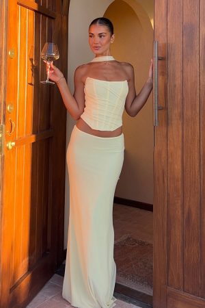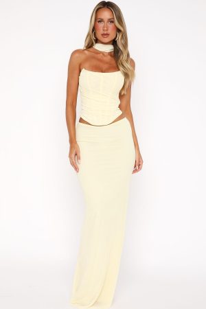The perfect blend of on-trend and a wardrobe essential. The Loving You Maxi Skirt Lemon Print features a mid-rise fit. maxi length. lined fabric. mesh fabric. high stretch and a raw cut hemline. Pair with the Lovers Lane Strapless Bustier and gold accessories for a look we love!