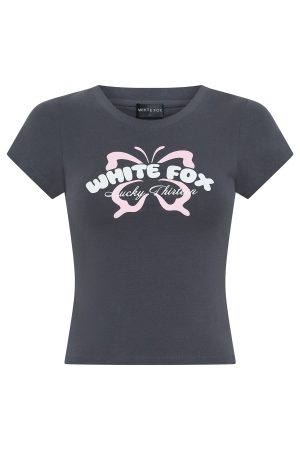 Make room in your wardrobes for the Lucky Thirteen Audrina Baby Tee in Volcanic! Features a crew neckline. cap sleeves. and a form fitting silhouette . At its centre. White Fox puff-print text pops. paired with a butterfly graphic and stretch material to ensure comfort and effortless movement. Style with the matching Lucky Thirteen Audrina Wide Leg Sweatpants and layer the Lucky Thirteen Audrina Boxy Zip Front Hoodie for colder days.