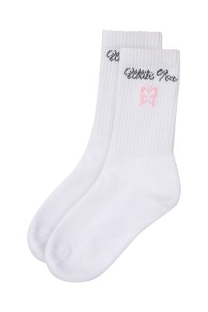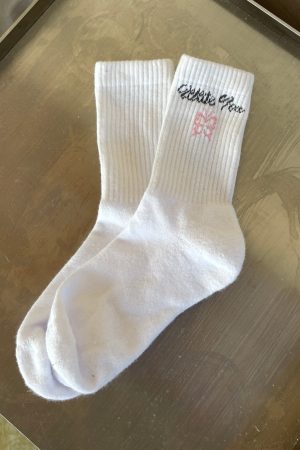 Street is the new chic! The Lucky Thirteen Audrina Socks White features cushioned crew design. embroidered White Fox text paired with butterfly graphic. ribbed ankle cuffs and arch band. Simply perfect.