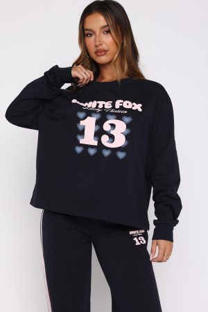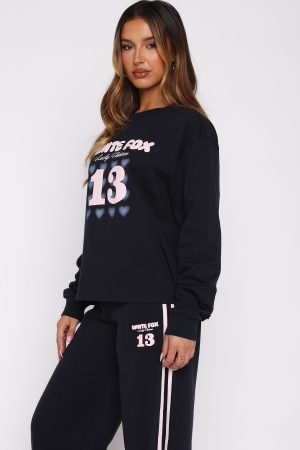 Romanticize your wardrobe with the Lucky Thirteen Charise Long Sleeve Tee in navy. This unlined relaxed piece features a crew neckline. slouched shoulders. and long sleeves with ribbed cuffs. White Fox puff‑print text anchors the center front. framed by a sweet love‑heart motif and layered with a playful ’13’ puff‑print accent for standout style. Pair with the matching Lucky Thirteen Charise Wide Leg Sweatpants.