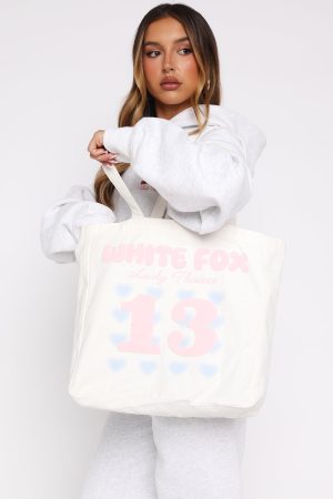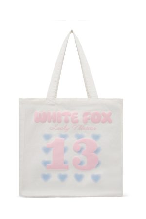 The vibe is: cute street style! The Lucky Thirteen Charise Tote Bag in Off White features dual shoulder straps. open-top design. internal pocket and puff print White Fox paired with printed love heart graphic at the front. We are in love!