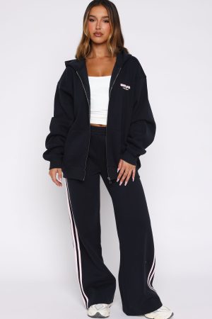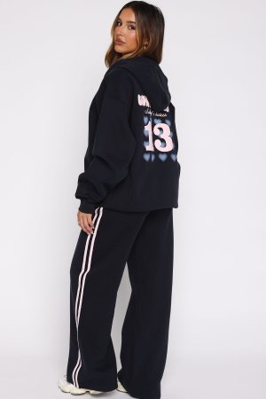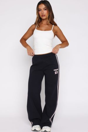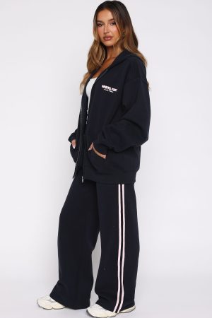 Lounge szn incoming! Introducing the Lucky Thirteen Charise Wide Leg Sweatpants Navy. Designed with a thick elasticated waistband. internal drawstring tie. and a wide-leg silhouette featuring double strip detailing. The White Fox puff-print text at the side adds a signature touch. while the unlined fleece interior ensures a cozy feel. Complete the look by pairing with the Lucky Thirteen Charise Zip Front Hoodie.