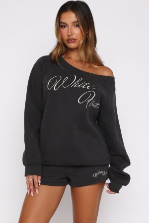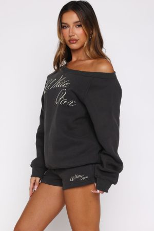 Newest obsession: cutesy loungewear! And ourLucky Thirteen Elsa Off Shoulder Sweater Charcoal nails the brief. Features a ribbed one shoulder neckline. long sleeve with ribbed cuffs. cursive stitched White Fox text centre front. ribbed waistline and Lucky Thirteen label at the nape. Cute gals wear matching sets…the Lucky Thirteen Elsa Lounge Shorts in Charcoal are the perfect combo!