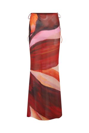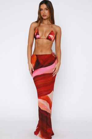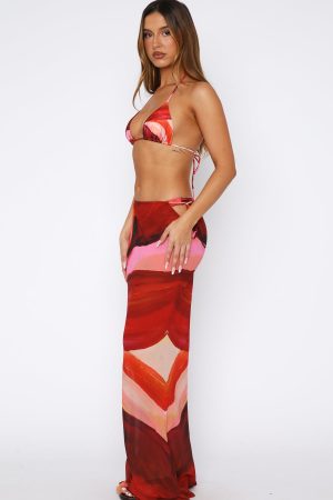 In a love affair with the Luminous Maxi Skirt in Sunset Petal! Features side cut out design. self ties for a desirable fit and semi sheer fabrication. Complete the look with a bikini set in Sunset Petal. kitten heels and gold accessories for the perfect beach club fit.