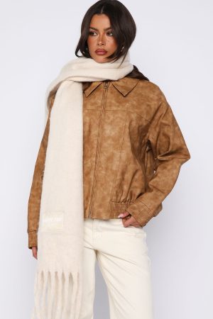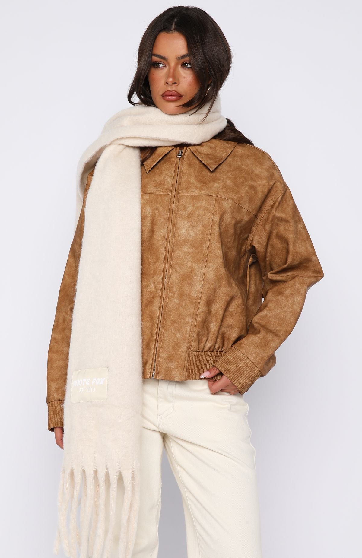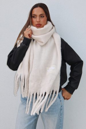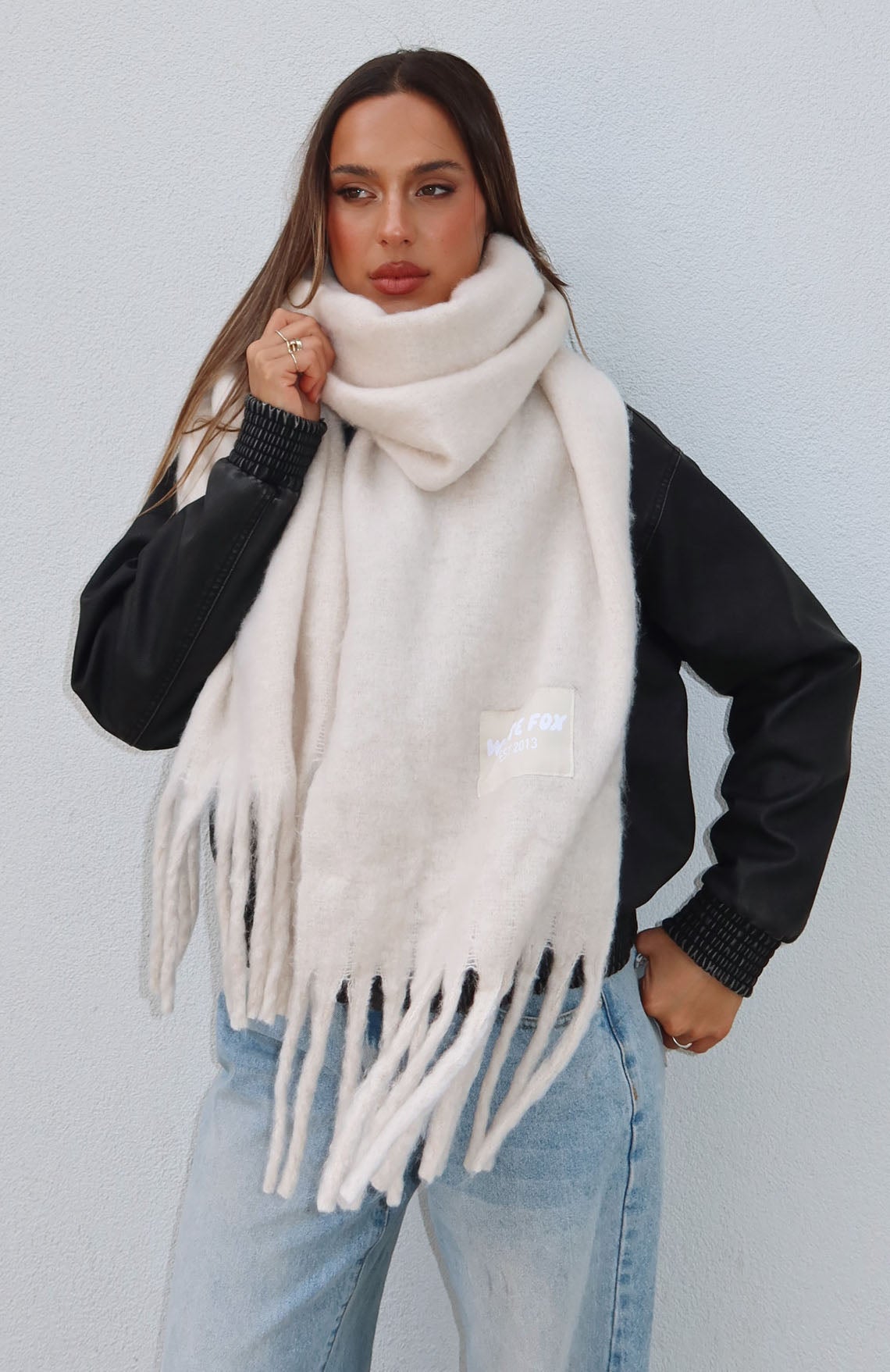 Snuggle season essentials. The Luna Scarf Oat features a warm knit material. White Fox patch and tassel detailing. We are obsessed!