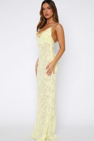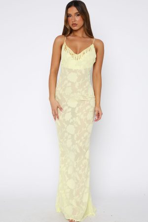 We are in love with the Lust For Life Maxi Dress in Lemon! Featuring delicate adjustable straps and a softly scooped neckline adorned with beading. this backless midi creates a graceful silhouette. The bust is thoughtfully lined for coverage. while the rest of the dress offers a semi-sheer finish that floats elegantly as you move. Pair with statement heels and layered gold jewellery for a summery dinner fit!