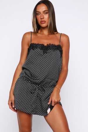 Girly girly in the Lustre Aura Mini Dress Black/White Polka Dot. Features thin adjustable shoulder straps. a flattering square neckline with delicate lace trim. and a drawstring‑tied waistband for a softly cinched silhouette. Cut from a smooth. silky fabrication and fully lined for comfortable wear. this playful polka dot pattern makes for effortless style. Style with kitten heels and simple gold jewellery for a classic. chic finish.