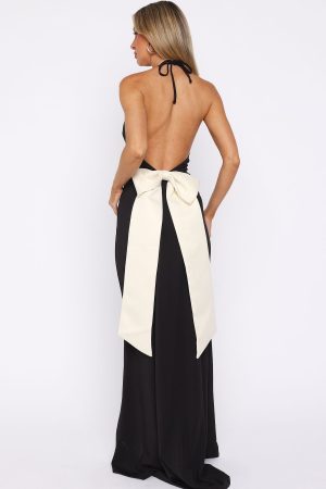 Bows and mistletoe! The Luxe Life Maxi Dress Black features halter straps that frame a dramatic plunge neckline. a fitted bodice that flows into a sweeping skirt. and an elaborate oversized bow at the lower back. Crafted from high‑stretch fabric and fully lined for comfort. Style with kitten heels for a holiday statement piece you’ll love to twirl in.