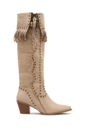 These boots were made for dancing! The Lyana Knee‑High Boots in Taupe Faux Suede features a closed pointed toe. sturdy block heel. and stud details. The knee fold‑over shaft with tassel accents. buckle and zipper detailing add edge. Perfect partner: a mini dress with layered jewellery.