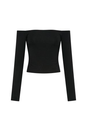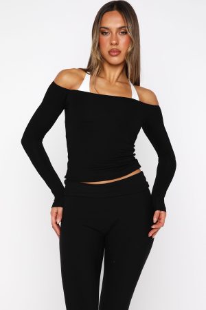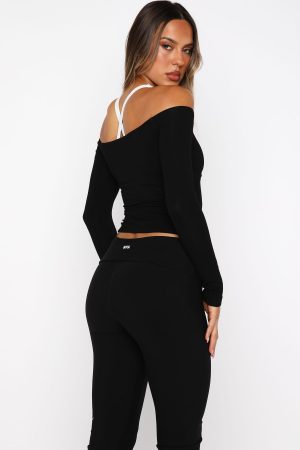 Active staples made to perfection! The Mad For You Long Sleeve Top in Black features an off the shoulder elasticated neckline. long sleeves. and a fitted silhouette. Crafted from high stretch fabric with a lined bodice. it offers both comfort and style. Pair with the matching Redemption Foldover Shorts Black.