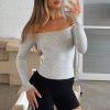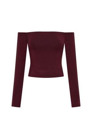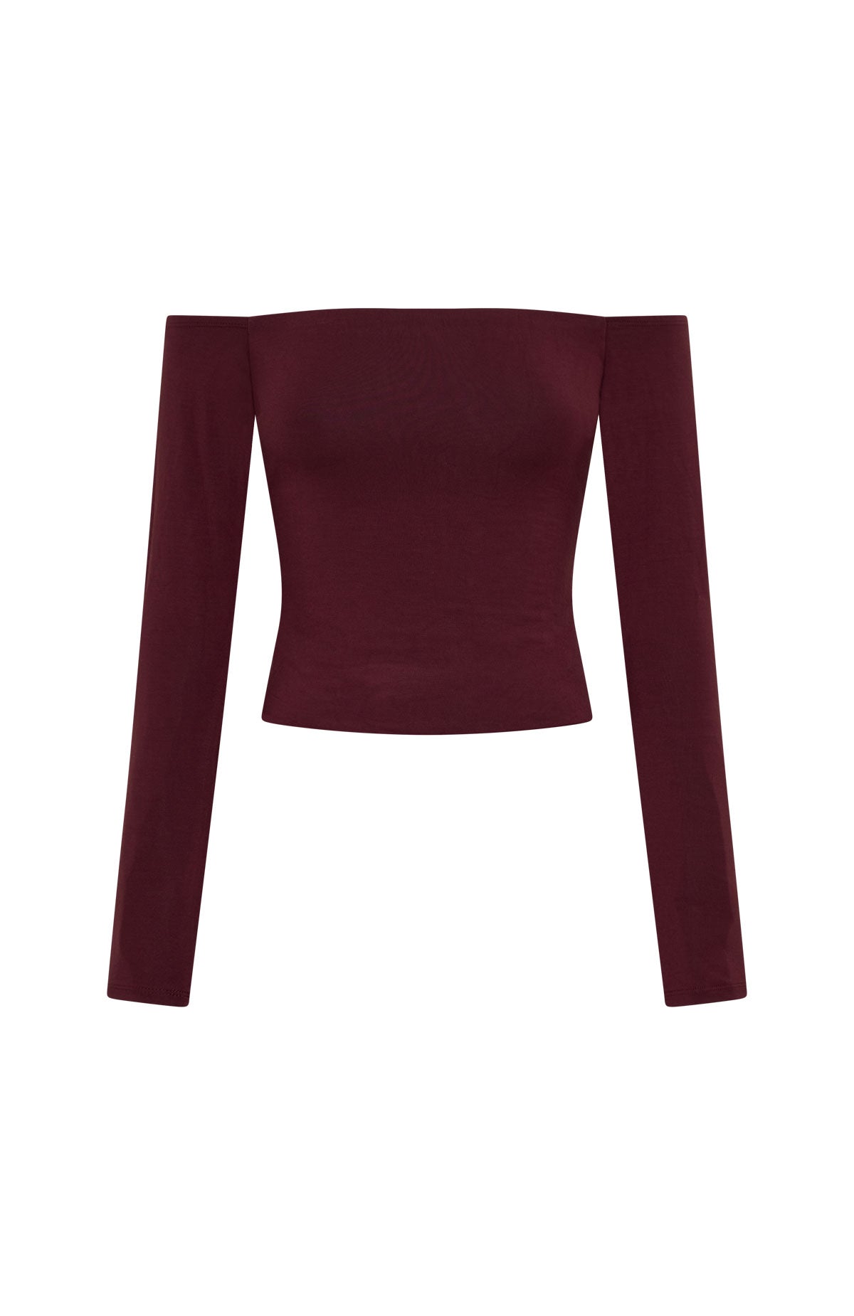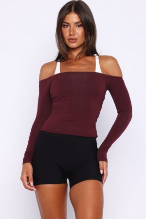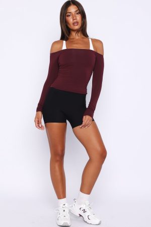 Active staples made to perfection! The Mad For You Long Sleeve Top in Merlot features an off the shoulder elasticated neckline. long sleeves. and a fitted silhouette. Crafted from high stretch fabric with a lined bodice. it offers both comfort and style. Pair with shorts and chunky sneakers for a street style active look.