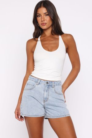 Effortlessly elevated. The Maddy Denim Shorts in Mid Blue reinvent a classic silhouette with a thick waistband with streamlined belt loops. and secure button-and-zip closure. Featuring five functional pockets and a sleek faux leather White Fox label at the back. they’re unlined for fresh. versatile styling that lasts. Pair with an oversized tee. kitten heels and layered gold jewellery for understated but stylish fit!