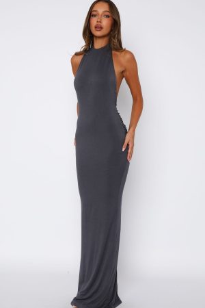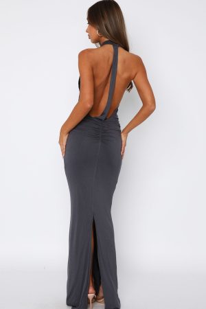 Our newest obsession: backless! The Made For You Maxi Dress in Steel features a halter neckline with hook and eye closure. backless design with strap from neck to lower back. ruched detailing on bottom. back leg split for ease of walkability and lined. Feel chic by pairing with heels and statement earrings!