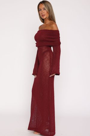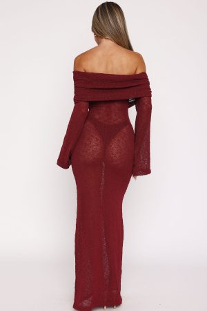 Need a dress to impress? We’ve got you covered. The Made It Out Long Sleeve Boucle Maxi Dress Burgundy features an off the shoulder design with a fold over detailing and bust grip tape. unlined bodice. maxi length. slightly sheer and stretch material for an easy slip on design.