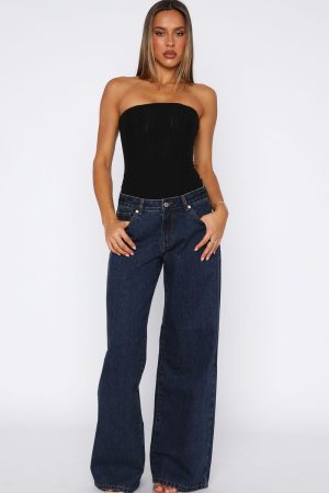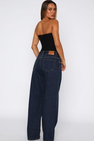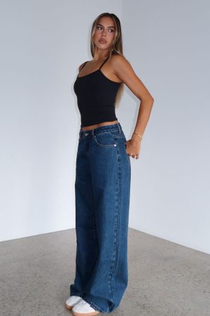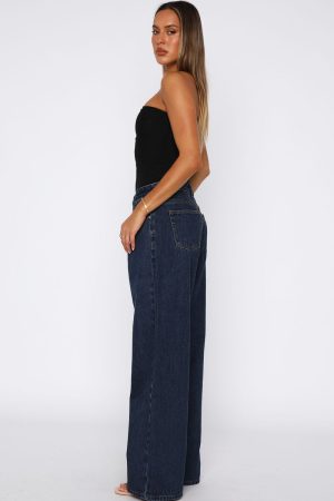 No capsule wardrobe is complete with the Maeve Low Rise Wide Leg Jeans Dark Blue. Featuring a low rise fit. wide leg design. front button and zipper closure. belt loops. 5 pocket design and back WF logo detailing. Pair with a fitted tee for a chic. 90s supermodel look!