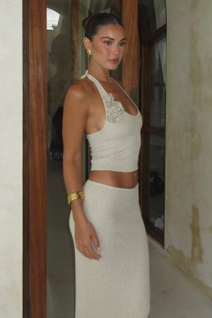 The Magic Memory Knit Halter Top Champagne features a halter neck design. backless. low scooped neckline. textured flower detailing. cropped length. unlined. stretch material for an easy slip on design and knitted fabric with metallic yarn for a subtle shimmer. Pair with the matching Magic Memory Knit Maxi Skirt to complete your OOTN!