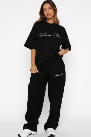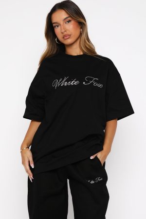 My go-to self-care tee. meet the Make It Or Break It Oversized Tee in Black. It has a relaxed. oversized fit with a classic crew neckline and short sleeves. and is finished with sparkling diamante White Fox text across the centre front. Style with the matching Make It Or Break It Wide Leg Sweatpant.