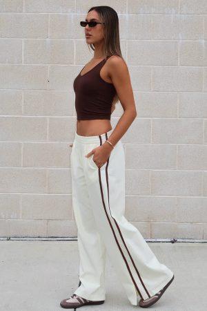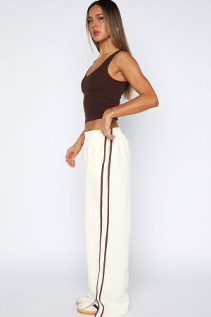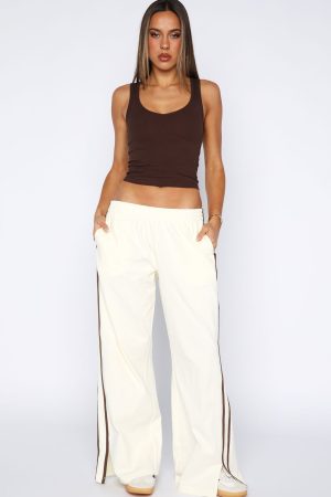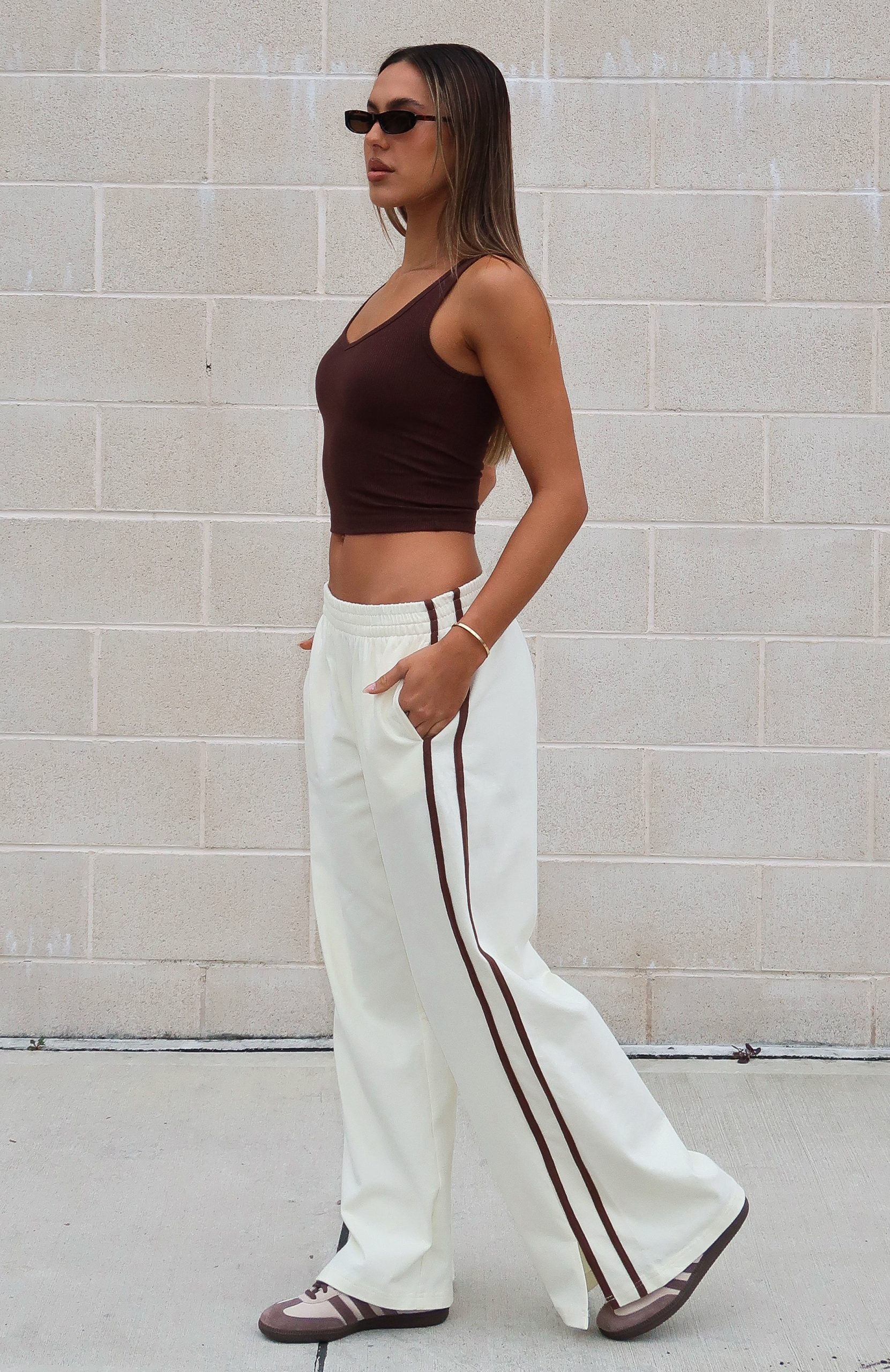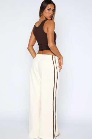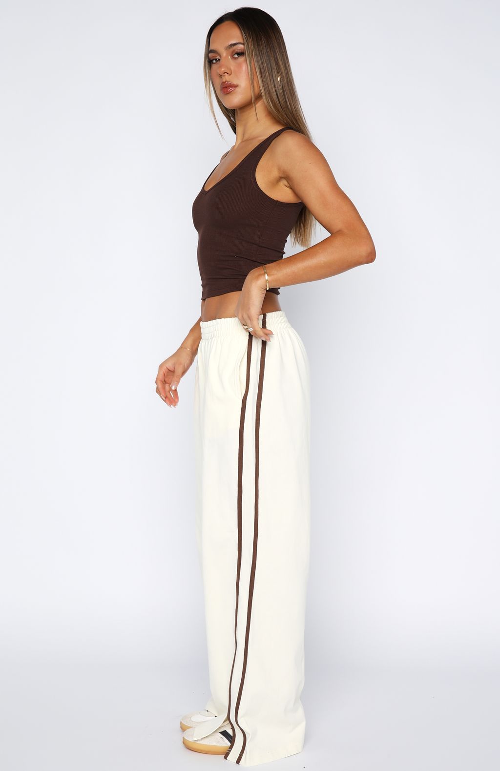 You asked we delivered! Introducing your newest fav pants. the Make Me Promises Pants in Cream. Designed with a thick elasticated waistband. side pockets. double stripe detailing down the side. split on pant hem. unlined material and relaxed fit. Finished with a double stripe detailing down the side for sporty vibe. Complete the look a basic tank and your fav sneakers for the perfect weekend casual fit!